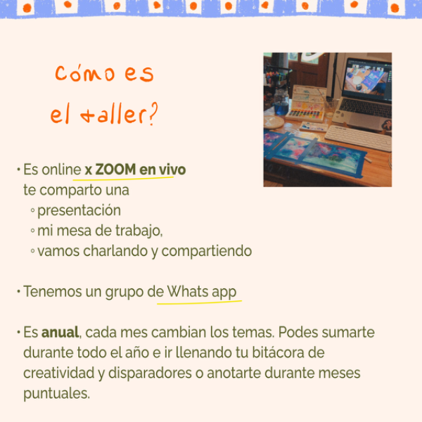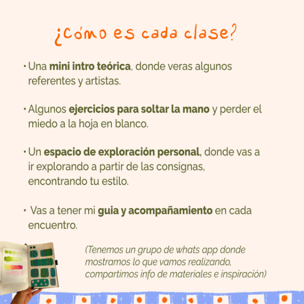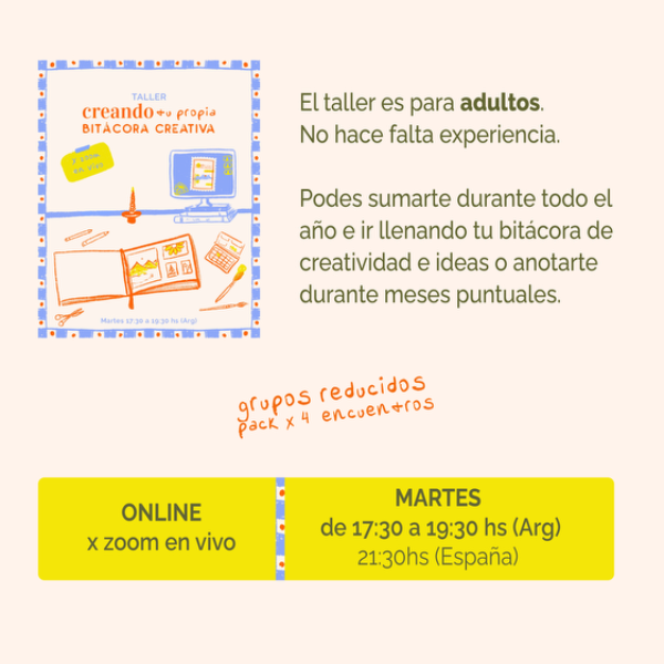 Te quiero acompañar en el proceso de crear tu propia bitácora, un espacio seguro de exploración de diferentes materiales y técnicas, para crear sin pensar en el resultado.Te ayudara a soltar la mano y te llevaras un cuaderno lleno de ideas que va a servirte para ver tu propio proceso y hasta puede ser el punto de partida para un futuro proyecto.
